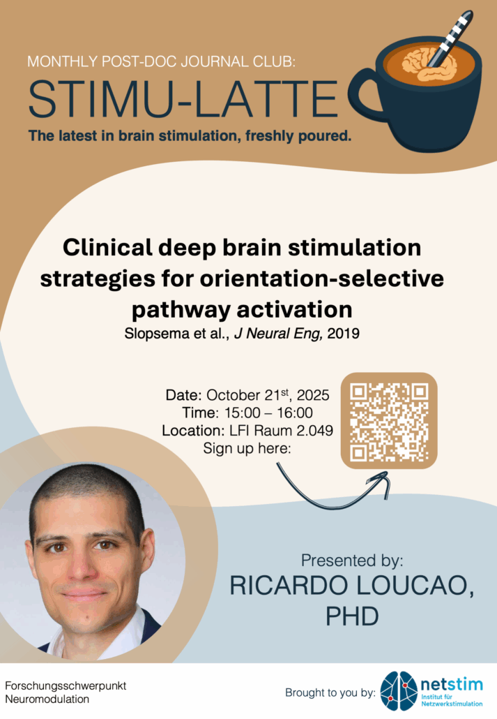 We are proud to present our new in-person journal club series: Stimu-latte! This post-doc-run journal club takes place once a month on Tuesdays at 3:00 PM. We will gather in a friendly environment and discuss the latest developments on neuromodulation over a cup of coffee. Coffee and snacks will be provided for the first session. Neuromodulation enthusiasts from all career levels are welcome! On this page, you can find upcoming and previous sessions. Looking forward to stimulating discussions!