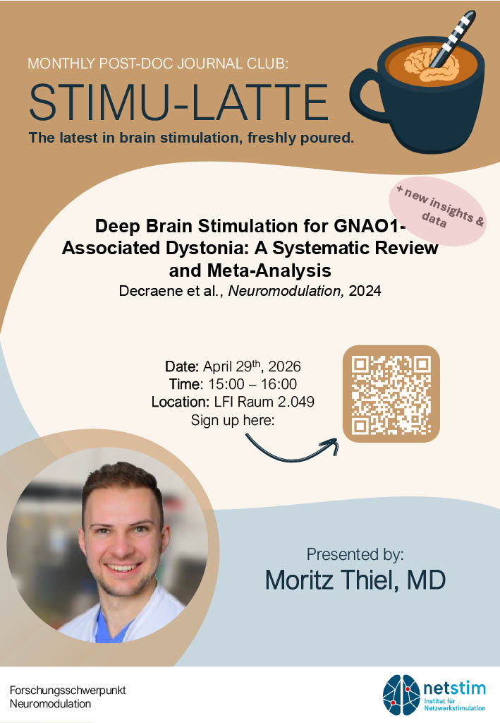 We are proud to present our new in-person journal club series: Stimu-latte! This post-doc-run journal club takes place once a month on Wednesdays at 3:00 PM. We will gather in a friendly environment and discuss the latest developments on neuromodulation over a cup of coffee. Neuromodulation enthusiasts from all career levels are welcome! On this page, you can find upcoming and previous sessions. Looking forward to stimulating discussions!